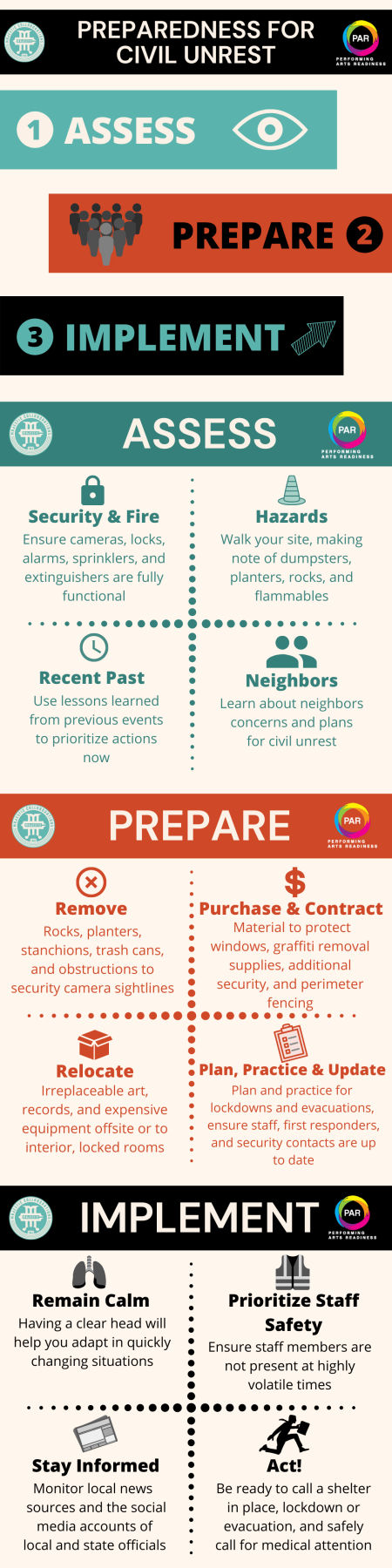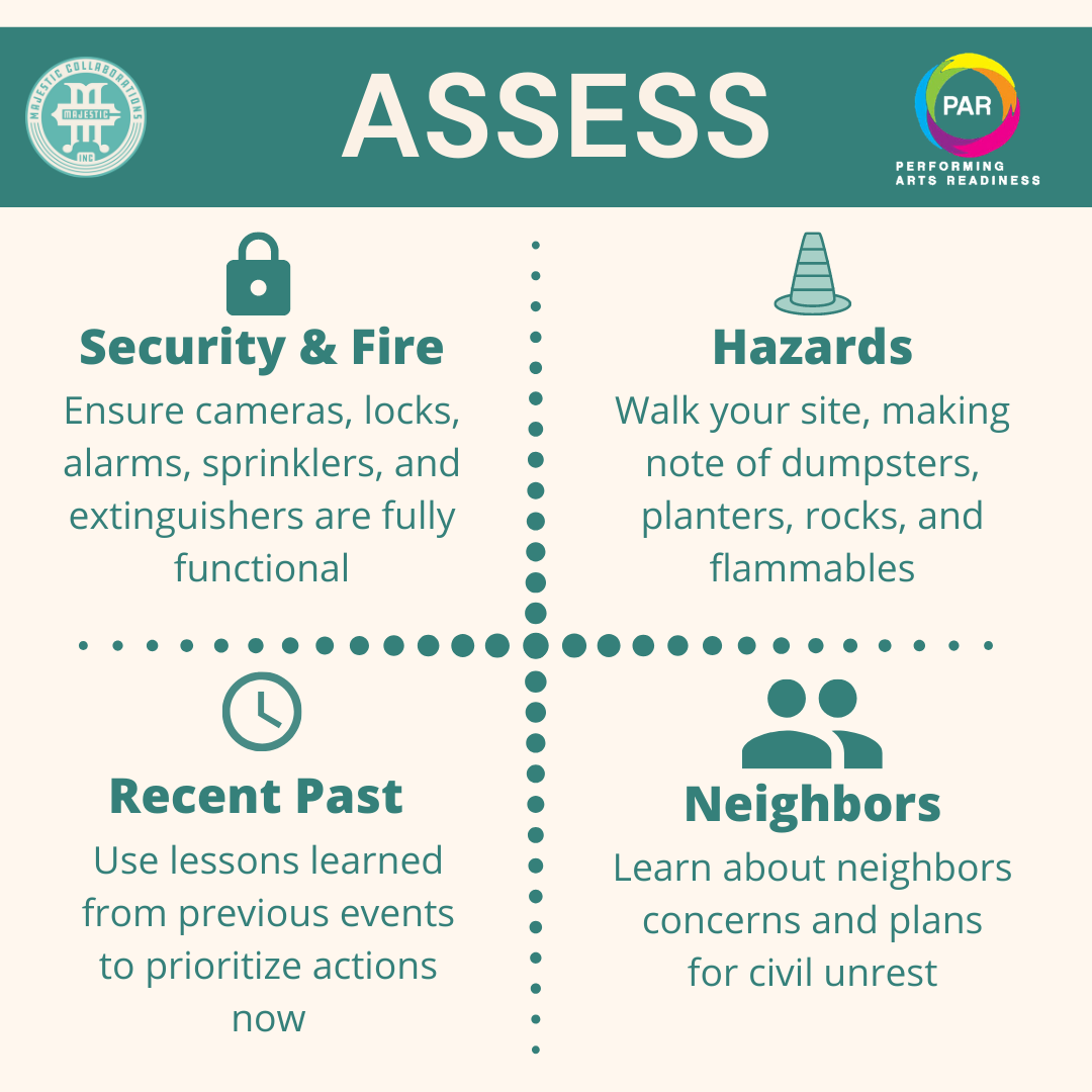 The first step is to assess your organization’s situation. Ask yourself what happened the last time there was civil unrest in your area and use those lessons to inform your actions. Ensure you conduct a site walk through, communicate with neighbors, locate and update important information, and secure or relocate your assets.
