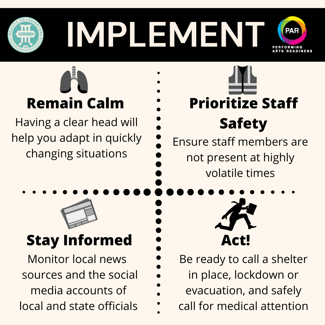 Once you’ve created a plan, be ready to implement it. It’s better to have a plan in place for evacuation or lockdown that didn’t end up necessary than to have wished you had. Don’t be afraid to take precautions and prioritize the safety of your staff and organization.