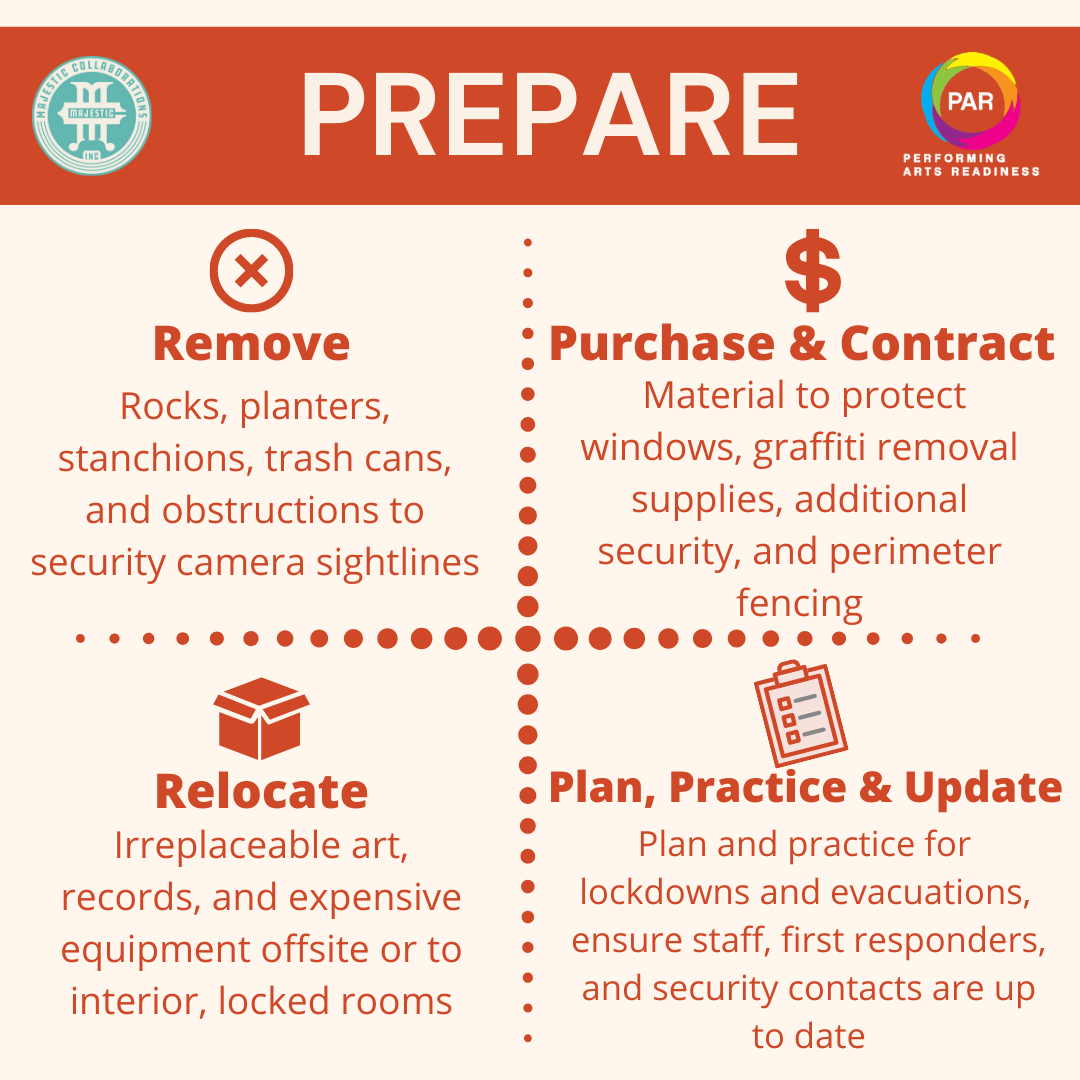 In sharing this content we hope this acts as a guide for organizations to prepare their spaces in the event of hostilities that threaten spaces integral to our communities and the culture and people they represent. We hope these resources will help preserve the safe, transformative, enlightening, and joyful nature of these spaces so that organizations can continue to welcome people into community.