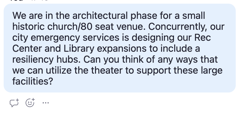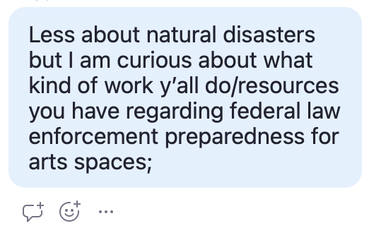 During the session, we shared the #ReadyWhen QuickStart Inventory, a 5-minute survey that jumpstarts the process of seeing your work through a resilience lens. Looking at the survey results together, the picture reinforces the central insight of the session: the arts & venues sector already holds substantial operational capacity; the opportunity lies in connecting that capacity to formal planning, funding, and public systems.